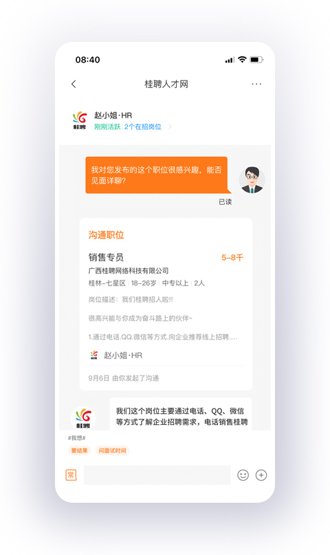 內置豐富的求職常用語,輕松掌握,簡單點擊,隨時隨地與HR溝通高效了解自己想要的招聘信息